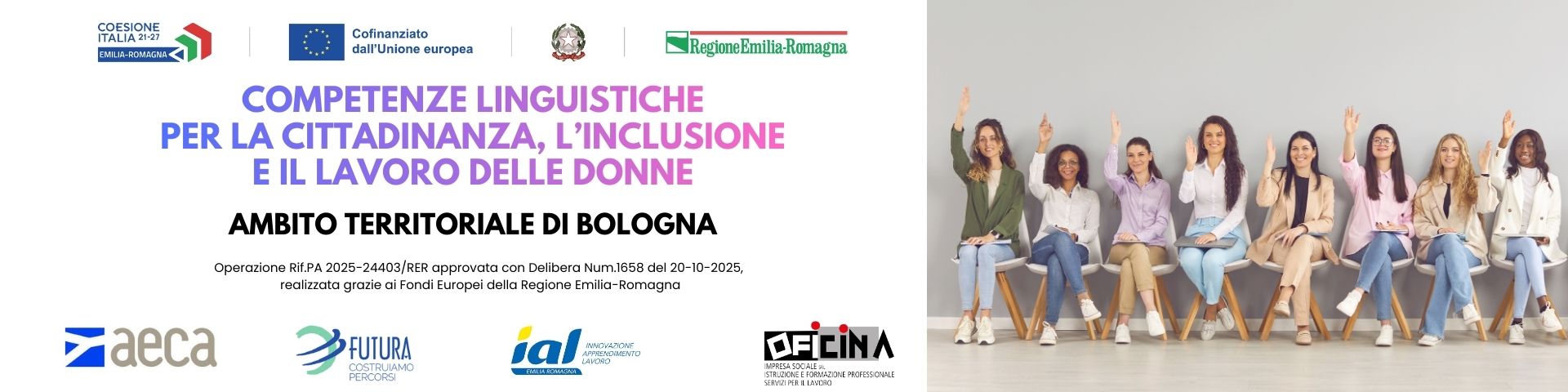Operazione Rif. PA 2025-24403/RER “Competenze Linguistiche per la Partecipazione alla Comunità e per l’Attivazione Verso il Lavoro delle Donne – Ambito Territoriale Bologna” approvata con DGR 1658/2025 del 20/10/2025, realizzata grazie ai Fondi Europei della Regione Emilia-Romagna